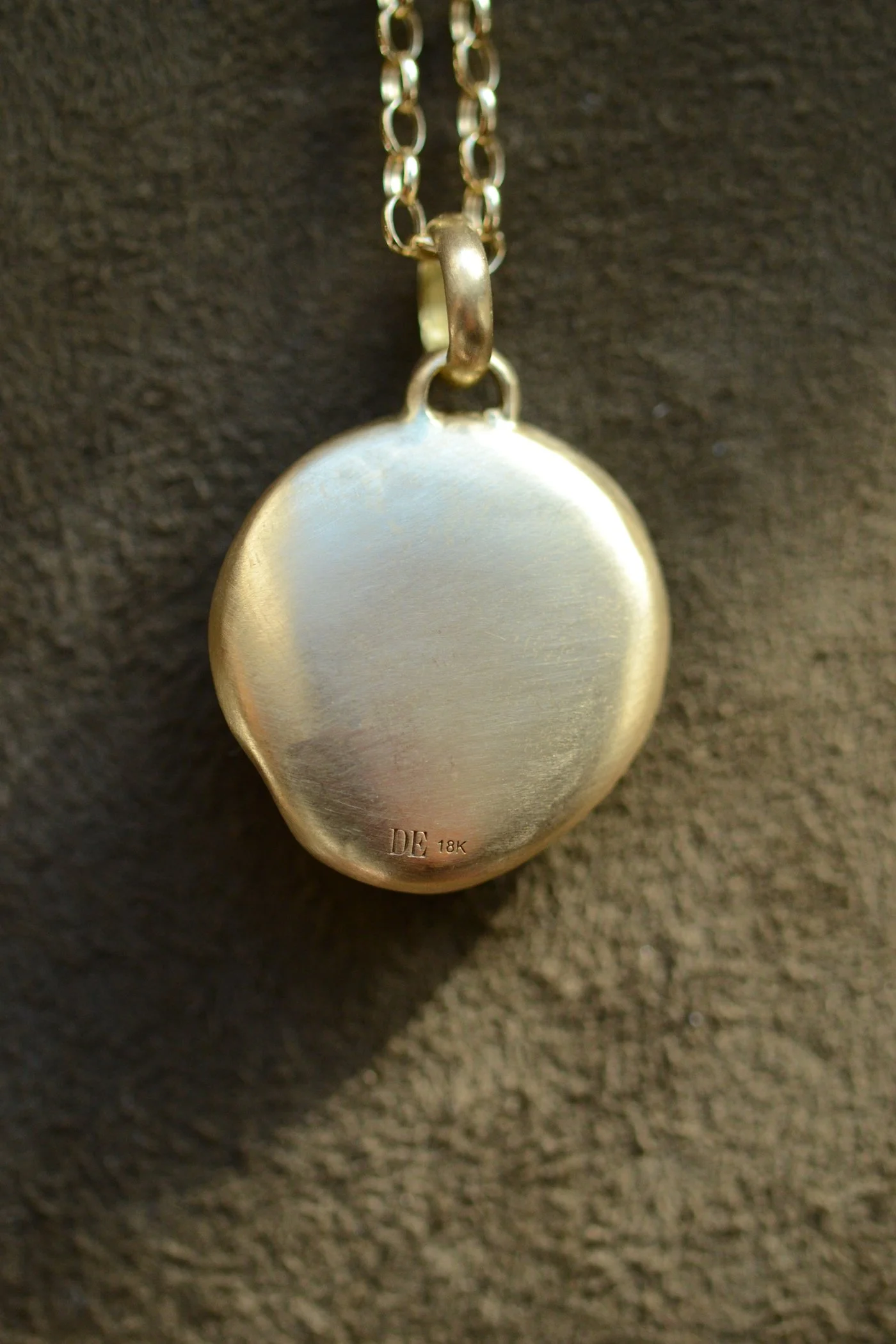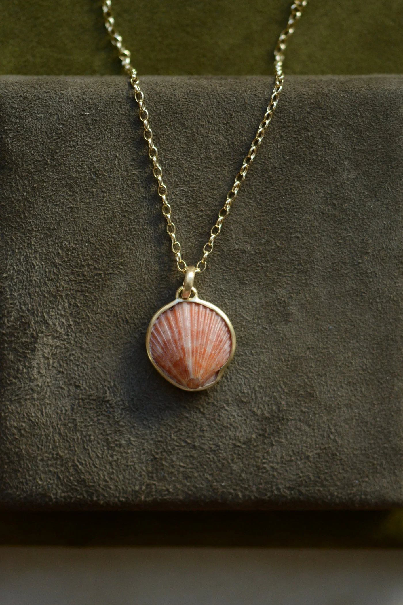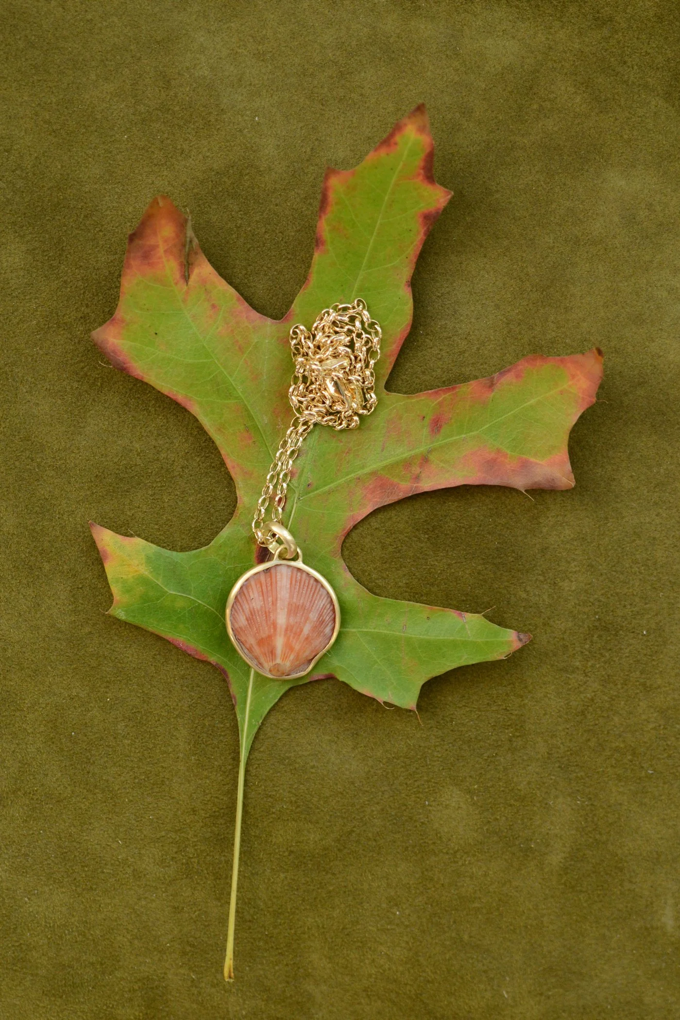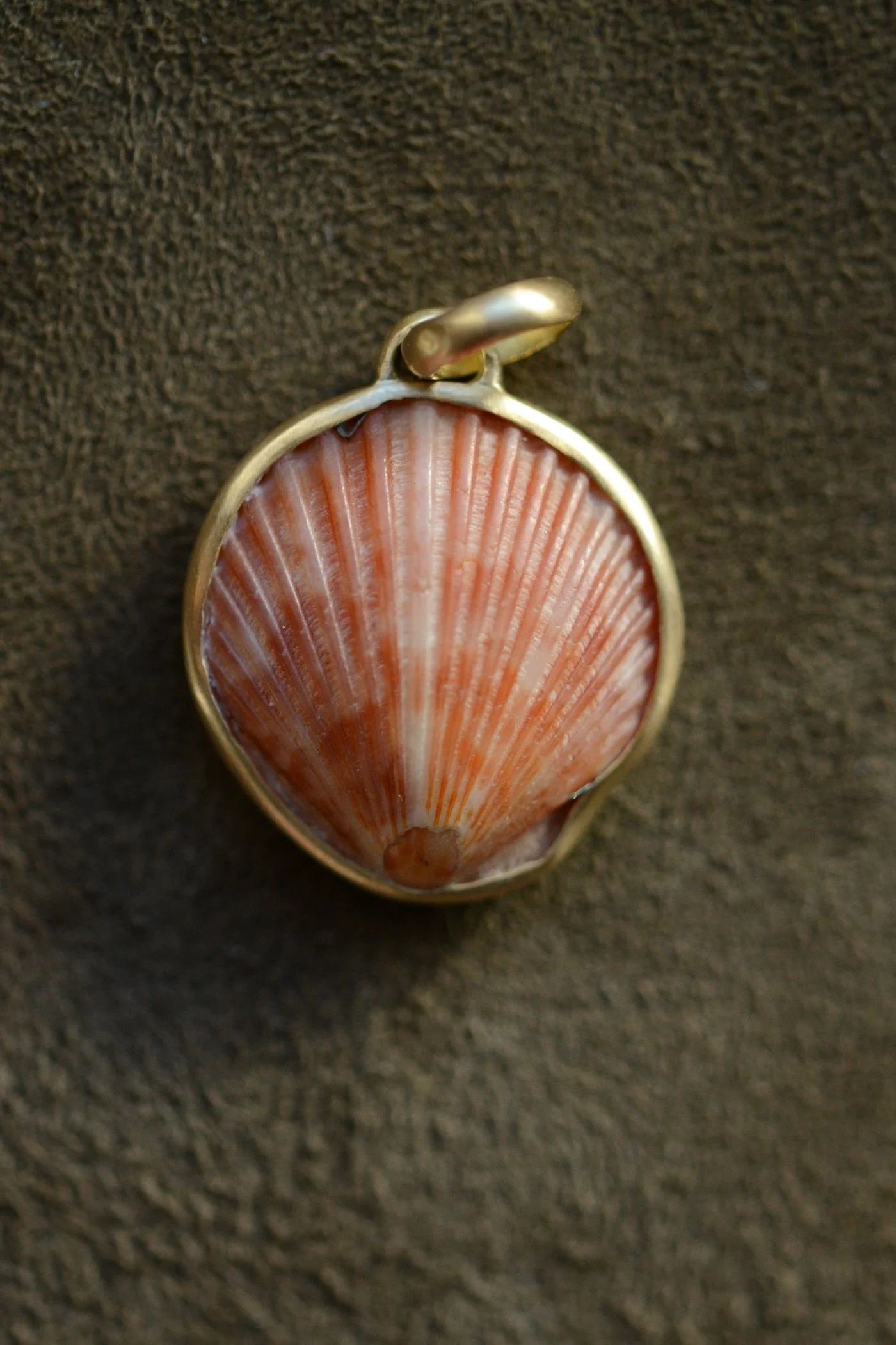 A coral nestled within a hand-carved solid 18k yellow gold setting with a blue sapphire.